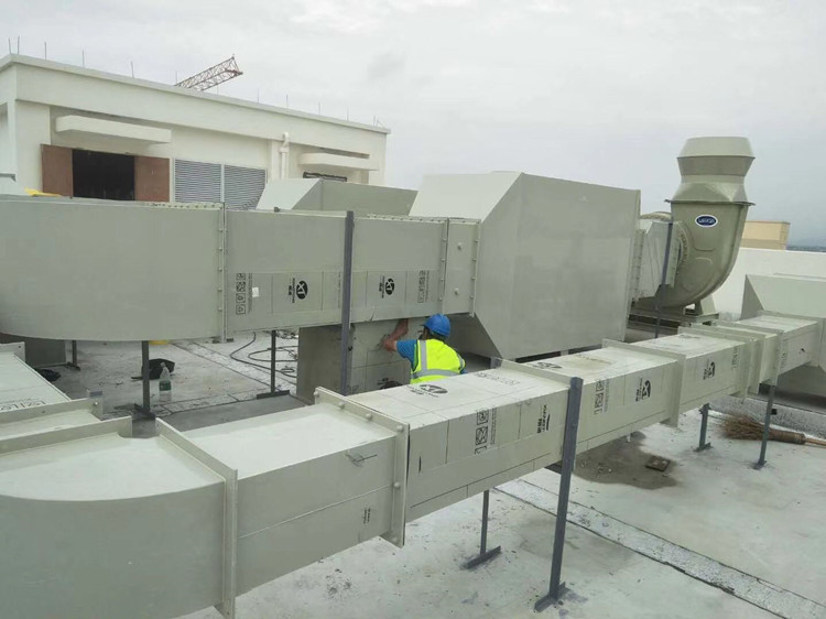 對高濃度的廚房火煙氣體采用旋流板水洗噴淋法,氣體在塔內由下向上高速運動,與自上向下噴出的洗滌液相接觸,增加氣液接觸面積和接觸時間,使尾氣與水在塔內和板面上充分接觸。尾氣中的污染物質碳黑在與噴淋水接觸過程中,得以凈化;尾氣中NOx、SO2等氣態污染物通過在噴淋水中加入的NaOH使噴淋水呈堿性,使NOx、SO2等氣態污染物得到中和達到良好的處理效果。